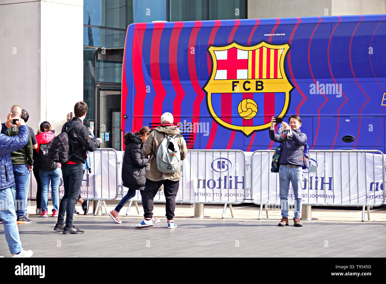 People Pose For Photographs In Front Of The Fc Barcelona Team Coach In Front Of The Hilton Hotel Liverpool Uk Stock Photo Alamy